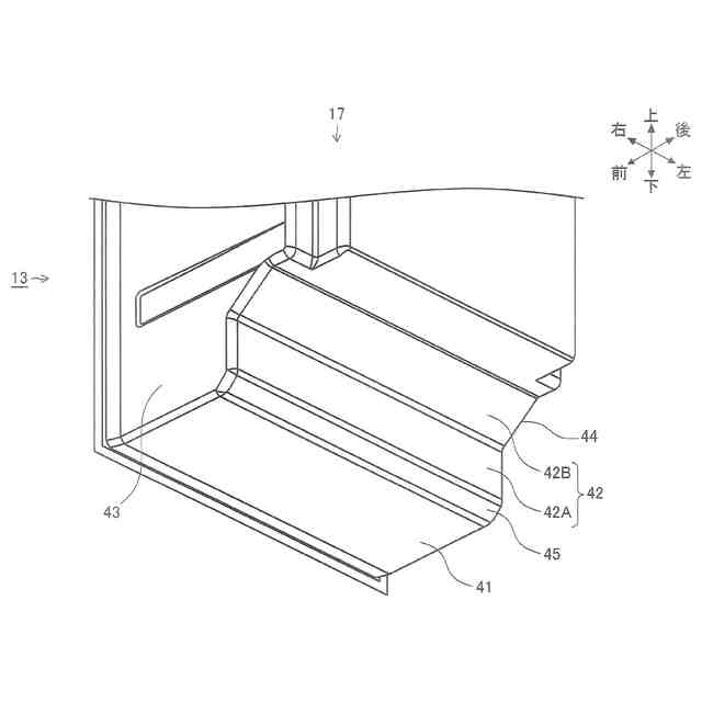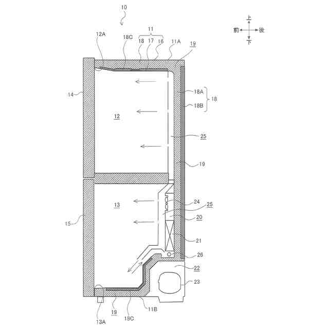 また、断熱箱体の貯蔵空間としては、断熱箱体の上部から、冷蔵室、製氷室及び上段冷凍室、下段冷凍室及び野菜室が形成される。そして、断熱箱体の天面板の上部には、冷蔵庫の運転を制御する電気部品が配設される。また、断熱箱体の野菜室の奥行方向の後方には、圧縮機等を配設する機械室が形成される。