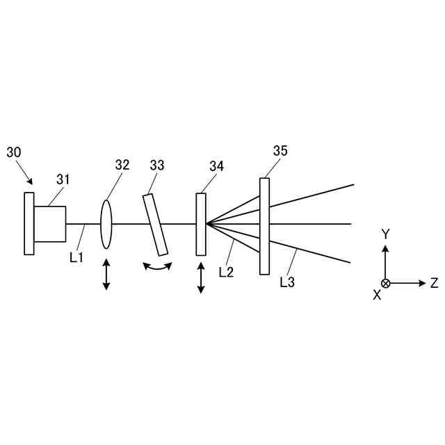 従来、レーザ光を回折光学素子により回折、分岐させて、スクリーン等の投影対象に所定の画像パターンを投影する投影装置がある。例えば、特許文献1には、回折光学素子を用いて線状パターンを投影可能な投影装置が開示されている。回折格子の形状を調整することで、複数のドットからなる画像パターンを投影することもできる。