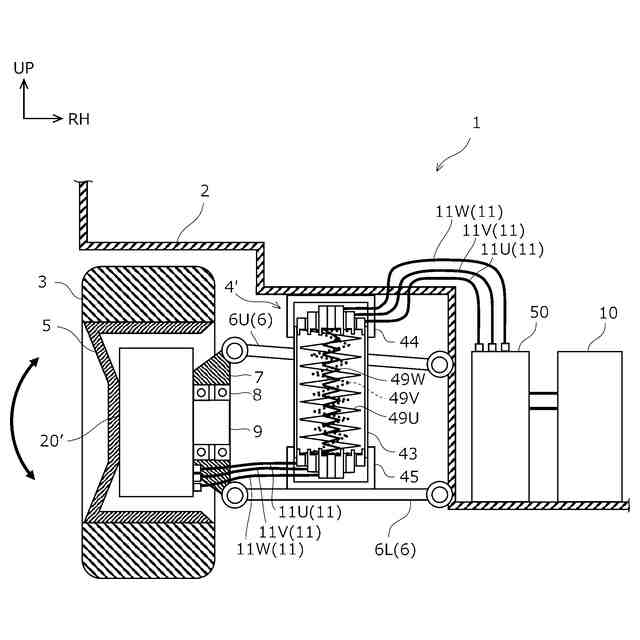 しかしながら、上記の特許文献1のような、サスペンション装置が配置された箇所に高圧電力線を配索する構造では、高圧電力線に曲げが加わりやすく電力線が疲労破断するおそれがある。また、曲げが加わりにくいように高圧電力線を配索した場合にはレイアウト上の制約が生じ得る。