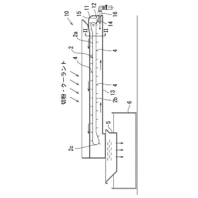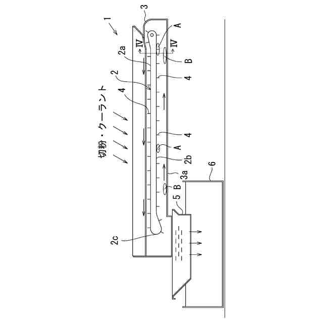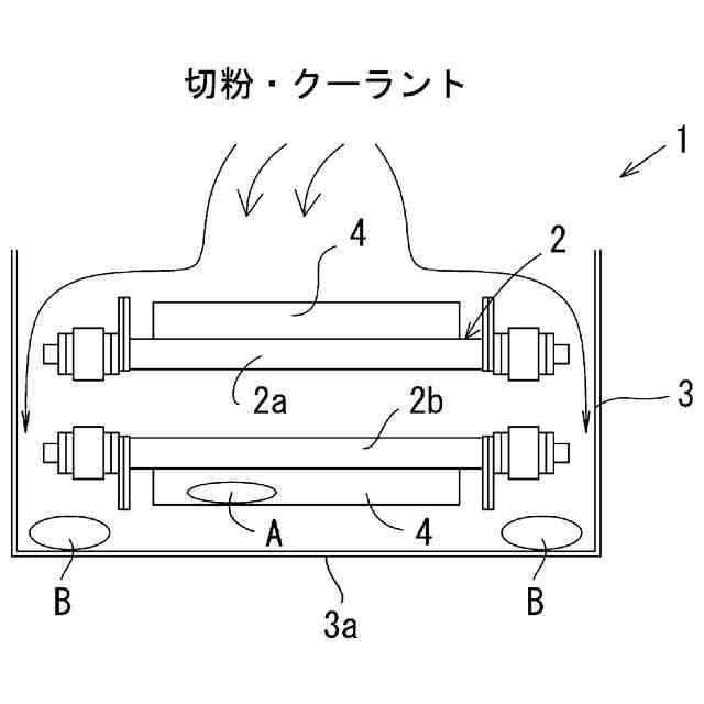 ベルトコンベア(2)は、往路(2a)において、切削クーラントとともに上方から落下する切粉を受けながら前方(図3の左方)に移動し、往路(2a)の終端部である切粉排出部(2c)に至り、切粉排出部(2c)の下方に配された受皿(5)に切粉および切削クーラントを落下させて排出した後、コンベアフレーム(3)の底板(3a)に沿って復路(2b)を後方(図3の右方)に移動する。受皿(5)に落下した切粉は、受皿(5)のメッシュ状底部で受け止められ、メッシュ状底部を通過した切削クーラントは、受皿(5)の下方に配置されたタンク(6)に蓄えられる。
