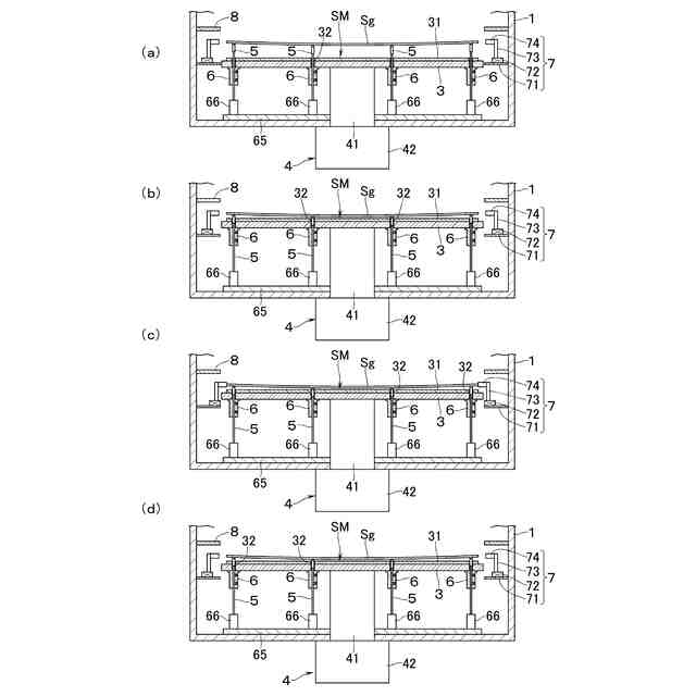 アライメント位置では、基板の外側面複数箇所を適宜押圧することで、各支持ロッドの上端面を摺動させてステージ本体に対する基板位置が修正される(位置合わせされる)。このとき、基板のXY平面における移動量やθ方向への回転角は予め実験的に求めておくことができる。他方、真空チャンバ内にCCDカメラなどの撮像手段を設け、アライメント位置にある基板を撮像し、そのときの撮像データを基に基板の移動量や回転角をその都度決定することもできる。基板位置が修正されると、ステージ本体を上方に更に相対移動させる。すると、各支持ロッドの上端部が貫通孔に没入した基板処理位置に到達し、ステージ本体上面の正規位置に基板が設置される。