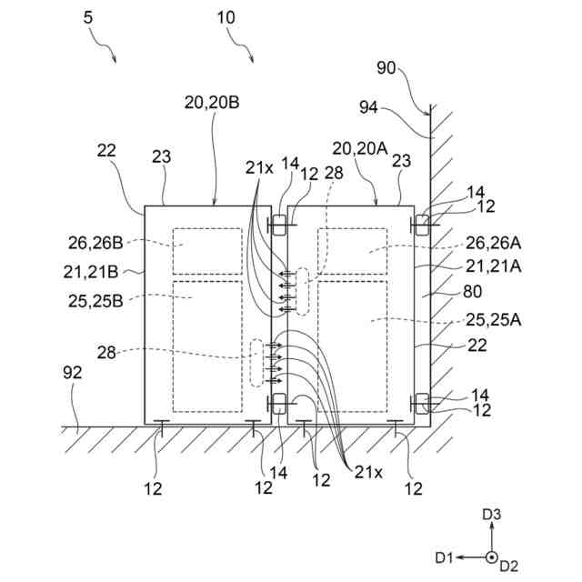 前記建物の内部に配置され、前記第1蓄電素子ユニットに、直接又はスペーサを介して、固定される第2蓄電素子ユニットと、を含む。