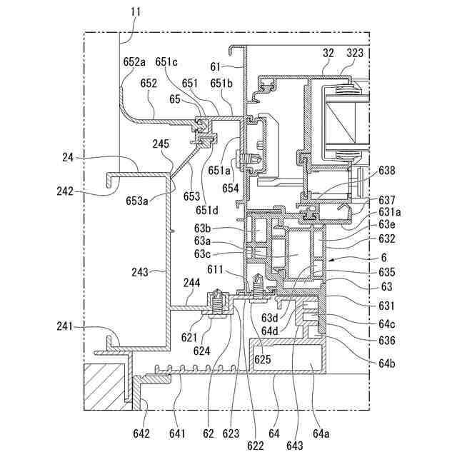 図3に示すように、既設上枠22は、屋内板部221と、屋外板部222と、上板部223と、突出板部224と、を有する。屋内板部221、屋外板部222および突出板部224は、それぞれ平板状である。屋内板部221、屋外板部222および突出板部224の板面は、屋内外方向を向いている。屋内板部221は、屋外板部222の屋内側に間隔をあけて設けられている。上板部223は、平板状である。上板部223の板面は、上下方向を向いている。上板部223の屋内側の端部は、屋内板部221の下端部と接続されている。上板部223の屋外側の端部は、屋外板部222の下端部と接続されている。突出板部224は、上板部223の屋内外方向の中間部から下方に突出している。突出板部224の下端部には、既存の障子26の上框261と接触する気密材224bが取り付けられている気密材取付部224aが設けられている。気密材取付部224aは、突出板部224よりも屋外側に突出している。既設枠21に新設枠31を取り付ける際には、気密材取付部224aから気密材224bが取り外される。