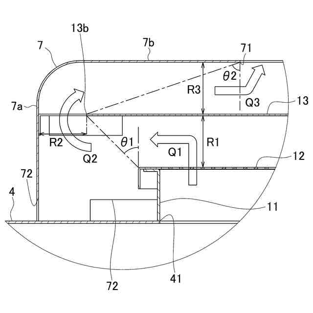 しかしながら、第2折れ部により排気される空気の流れを下向きにする部位が発生するため、空気の流路にあたかも壁が形成された状態となり、排気がスムーズに行われず熱だまりが発生し易い問題があった。