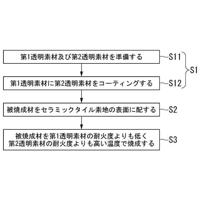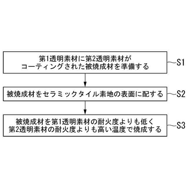 前記被焼成材を前記第1透明素材の耐火度よりも低く前記第2透明素材の耐火度よりも高い温度で焼成して、前記セラミックタイル素地の表面に前記第1透明素材で形成された芯部と、前記第2透明素材で形成され前記芯部の表面の少なくとも一部を覆う半球状の被覆部と、を備える突起を形成することと、