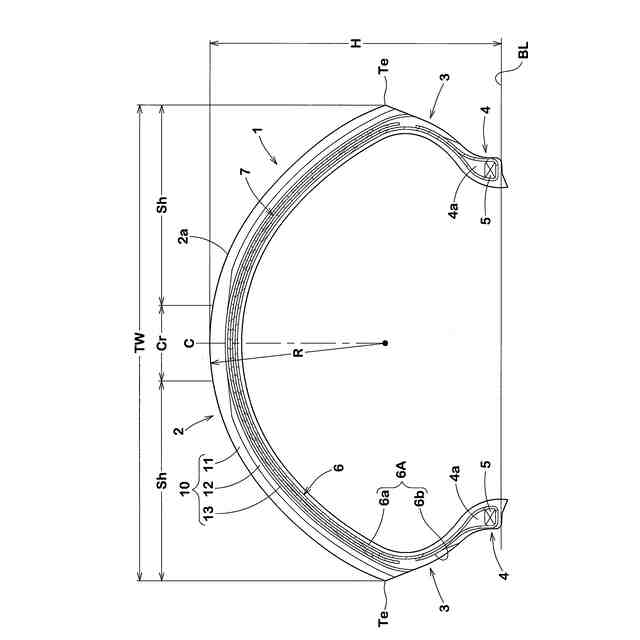 前記表層及び前記底層は、前記一対のショルダー領域の一方から前記クラウン領域を通って前記一対のショルダー領域の他方へと延びており、