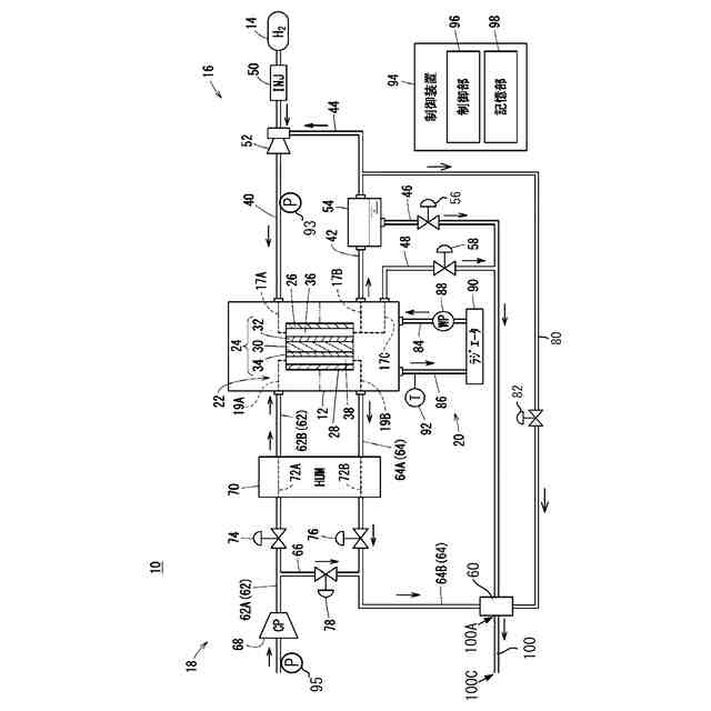 図1は、本発明に係る燃料電池システム10の概略構成図である。燃料電池システム10は、車両(燃料電池自動車)に搭載される。これとは別に、燃料電池システム10は、例えば、船舶、航空機、ロボット等にも搭載可能である。燃料電池システム10は、燃料電池スタック12と、水素タンク14と、アノードシステム16と、カソードシステム18と、冷却システム20とを有する。また、燃料電池システム10は、制御装置94を有する。燃料電池スタック12の出力(電力)は、モータ等の負荷(不図示)に供給される。