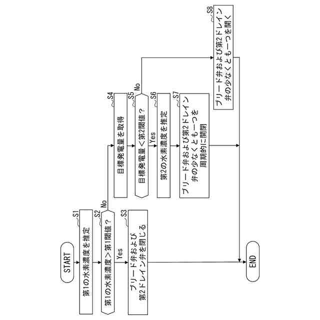 前記アノード排出流体の水素濃度をさらに取得し、前記アノード排出流体の水素濃度が所定の濃度閾値以下、かつ、前記燃料電池スタックの発電量が前記発電閾値を超える場合に、前記アノード排出弁を開く、