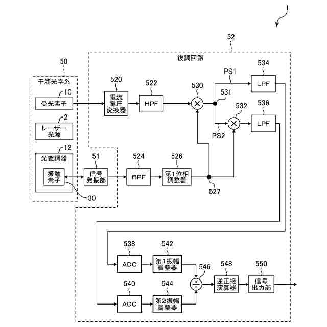 【解決手段】振動素子を用いてレーザー光に変調信号を付加する光変調器と、サンプル信号および変調信号を含むレーザー光の強度変化を検出し、レーザー光受光信号を出力する受光素子と、振動素子を源振として第1周波数の基準信号を発生させる信号発振部と、基準信号に基づいて、レーザー光受光信号からサンプル信号を復調する復調回路と、を備え、復調回路は、オフセットを除去するDCオフセット除去部と、基準信号の位相を調整する第1位相調整器と、レーザー光受光信号と基準信号とを乗算する第1乗算器と、第1フィルターと、第1乗算信号と基準信号とを乗算する第2乗算器と、第2フィルターと、位相を算出する位相算出器と、を有するレーザー干渉計。