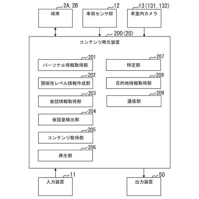 上述したような場面等において、コンテンツ再生装置は、乗員に対して心理的・肉体的に負担の少ない会話促進のためのサービスを提供する。