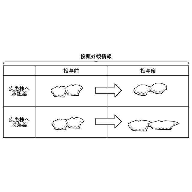 投薬外観情報は、例えば細胞の外観を撮影することによって得られる画像であってもよい。このような画像は、どのような態様の画像であってもよい。例えば、特に細胞の組織を染色することなく可視光画像として撮影することによって得られる画像であってもよい。細胞の組織を染色し、染色の態様に応じた波長の光を撮影することによって得られる画像であってもよい。位相差画像として得られる画像であってもよい。投薬前の疾患株の画像と、投薬後の疾患株の画像と、の両方が投薬外観情報として用いられても良いし、投薬前の疾患株の画像は用いずに投薬後の疾患株の画像が投薬外観情報として用いられても良い。