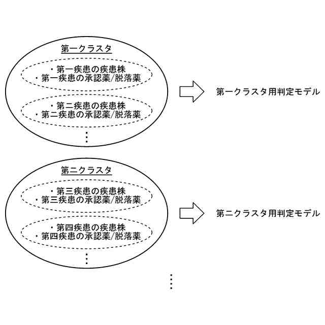 図1は、判定モデルの生成に用いられる投薬外観情報の第一具体例を示す図である。第一具体例では、疾患株へ承認薬を投与したことによって得られる投薬外観情報と、疾患株へ脱落薬を投与したことによって得られる投薬外観情報と、を用いて判定モデルが生成される。疾患株は、特定の疾患に罹患している患者から得られる細胞であってもよいし、特定の疾患に罹患している状態を模した細胞であってもよい。疾患状態を模した細胞は、例えば遺伝子操作によって作られた疾患モデル細胞であってもよい。