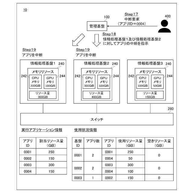 【解決手段】システム10において、メモリリソースを有する複数の情報処理基盤を管理する管理基盤は、各情報処理基盤のメモリリソースの空きリソース量を示す空きメモリリソース量情報と、複数の情報処理基盤の各情報処理基盤上で実行中のアプリケーションの数を示すアプリケーション数情報とを取得し、アプリケーションの実行要求を受け付け、実行要求に含まれ、実行対象のアプリケーションを実行するために割り当てられる必要があるメモリリソースの割当リソース量を示す割当リソース量情報と、空きメモリリソース量情報と、アプリケーション数情報とに基づいて、実行対象のアプリケーションを実行する情報処理基盤として、複数の情報処理基盤の中から、実行中のアプリケーションの数が最も少ない情報処理基盤を選択する。