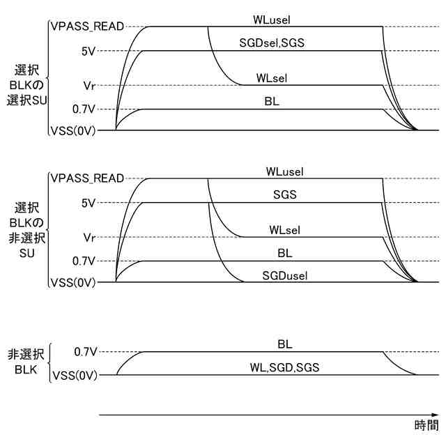 読み出し動作時における各配線の電位変化を示す図。