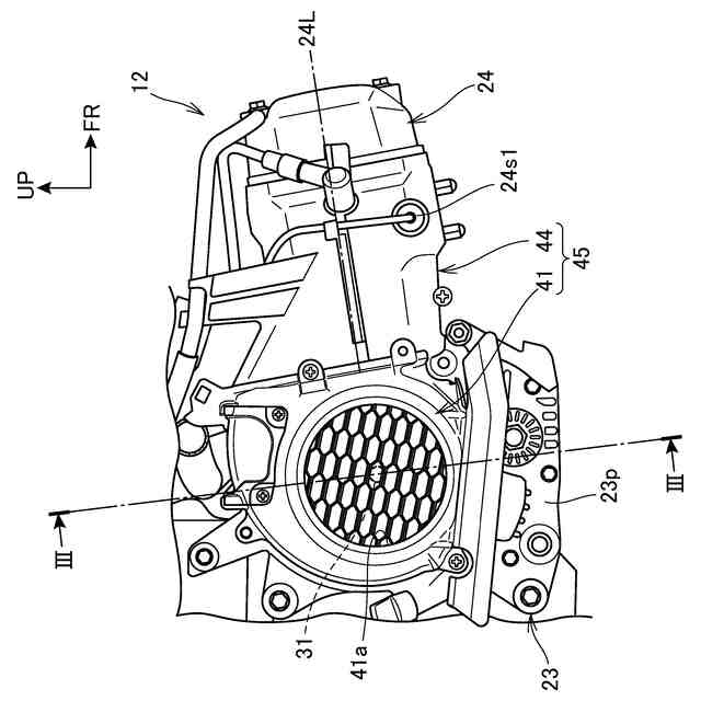 車体フレーム11は、車体フレーム11の前端部に設けられるヘッドパイプ18と、ヘッドパイプ18の後方に位置するフロントフレーム19と、フロントフレーム19の後方に位置するリアフレーム20とを備える。フロントフレーム19の前端部は、ヘッドパイプ18に接続される。