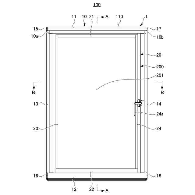 図2~図5に示すように、枠体10は、上枠11(横枠、横材)、下枠12(横枠、横材)及び左右の縦枠13,14(吊元側縦枠13及び戸先側縦枠14)(枠、縦材)が矩形に枠組みされて構成される。上枠11、下枠12及び左右の縦枠13,14は、アルミニウム材料などの金属材料を押出し成形することで形成される。