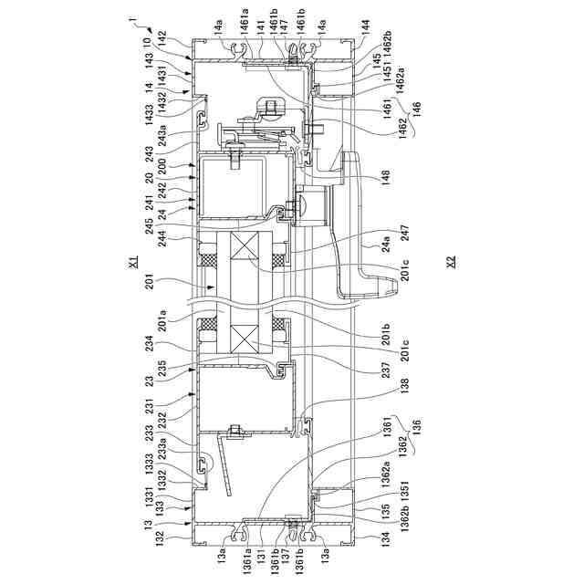 第1実施形態について説明する。第1実施形態は、建具を、縦辷り出し窓1により構成した実施形態である。図1~図3に示すように、縦辷り出し窓1(建具)は、建物躯体100に設けられた開口部110に納められる。縦辷り出し窓1は、枠体10(フレーム体)と、枠体10内に開閉可能に配置される障子20と、を備える。枠体10は、建物躯体100に固定されている。障子20は、戸先側を室外側X1に押出し、吊元側に設けられた図示しない回動軸を中心として回動させることで、開放可能となっている。