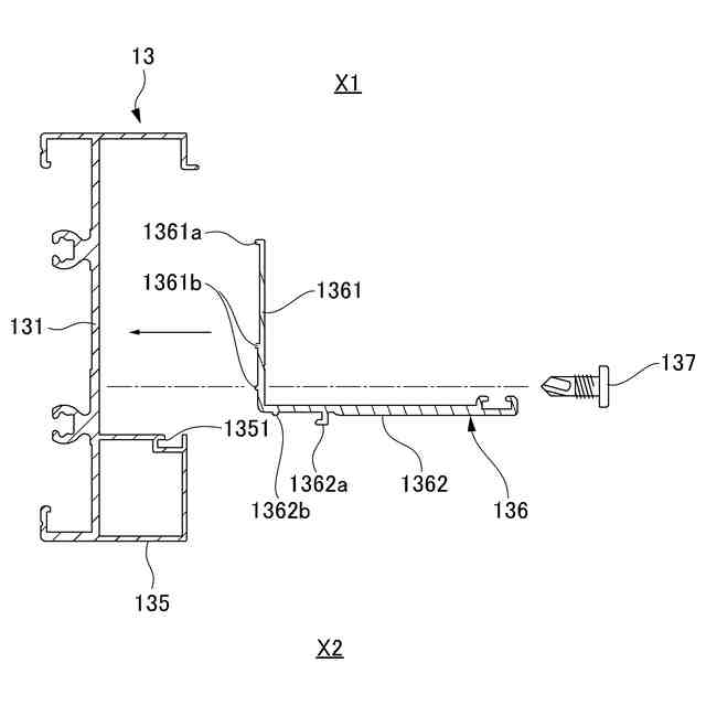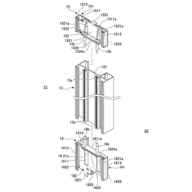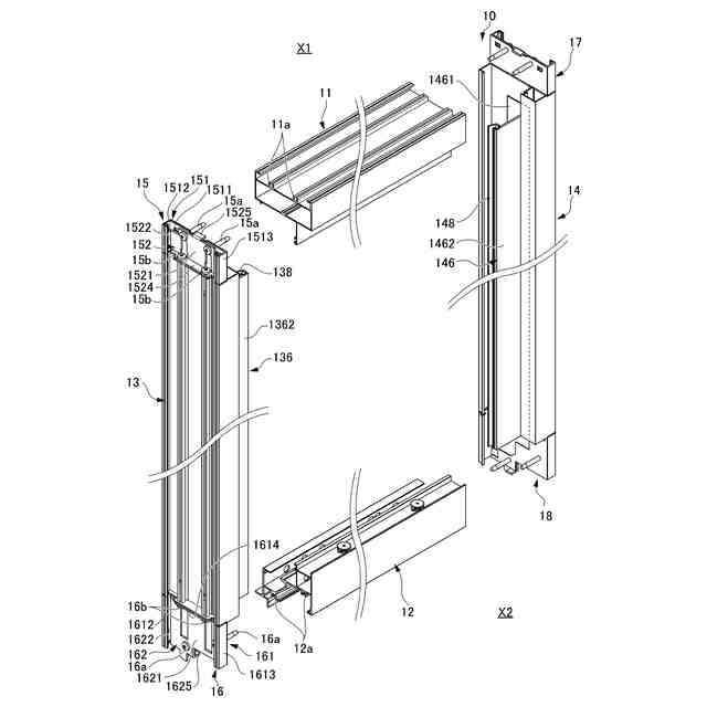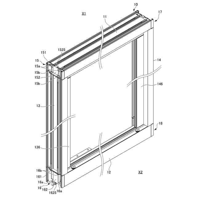 図2~図5に示すように、枠体10は、上枠11(横枠、横材)、下枠12(横枠、横材)及び左右の縦枠13,14(吊元側縦枠13及び戸先側縦枠14)(枠、縦材)が矩形に枠組みされて構成される。上枠11、下枠12及び左右の縦枠13,14は、アルミニウム材料などの金属材料を押出し成形することで形成される。