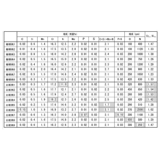 質量%でCr:16.0~18.0%、Ni:12.0~15.0%、C:0.03%以下、Si:1.0%以下、Mn:2.0%以下、Mo:2.0~3.0%、N:400~2000ppm及び残部がFe及び不可避的不純物であって、C+Si+Mn+N:2.0超~3.0%、Cr