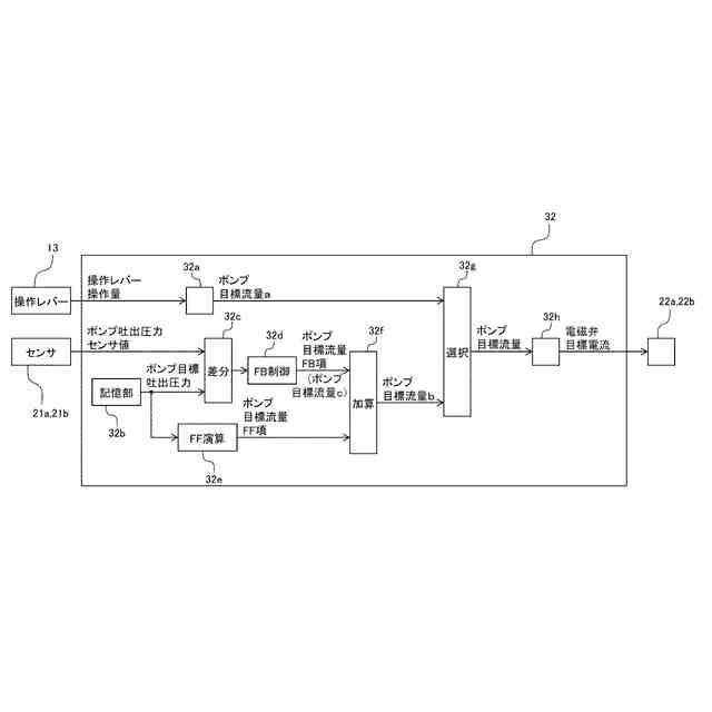 の差分にフィードバック制御を適用した値と、前記ポンプ目標吐出圧力にフィードフォワード演算を適用した値とに基づいて第二の目標流量を演算するとともに、