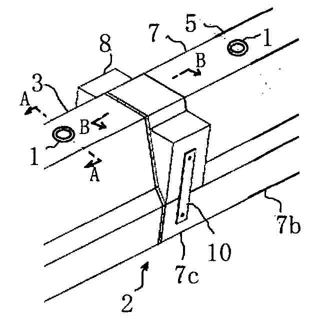 請求項2に記載の発明は、前記主ブロックの底部を隣接の前記既設消雪ブロックの端面に向かって延出させて延長底部を形成し、前記補助ブロックの下方にU字形状の切欠きを設け、この切欠きが前記新規送水管の前記先端を貫通し、前記補助ブロックの下端を前記延長底部の上面に当接することを特徴とする請求項1に記載の消雪装置である。