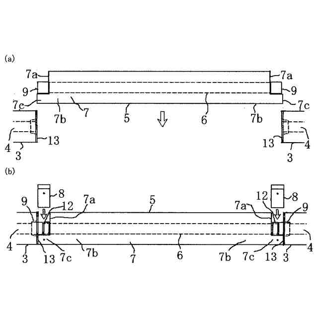 請求項1に記載の発明は、散水ノズルが設置される複数の消雪ブロックを路面に埋設する消雪装置であって、前記消雪ブロックは既設消雪ブロックと、交換した新設消雪ブロックとを連結してなり、前記新設消雪ブロックを主ブロックと補助ブロックとに分割し、前記補助ブロックは前記主ブロックの端面と隣接の前記既設消雪ブロックとの間に挿入可能に介在し、前記新設消雪ブロックに有する新規送水管の先端を前記主ブロックの前記端面より前記補助ブロックの幅以内に突出させ、前記新規送水管の前記先端に管軸方向に移動可能な管継手を嵌合し、この管継手の管軸長を前記補助ブロックの幅以下にして、前記新規送水管の前記先端と隣接の前記既設消雪ブロックの既存送水管とを前記管継手により接続し、前記主ブロックの前記端面と隣接の前記既設消雪ブロックとの間に前記補助ブロックを挿入することを特徴とする消雪装置である。