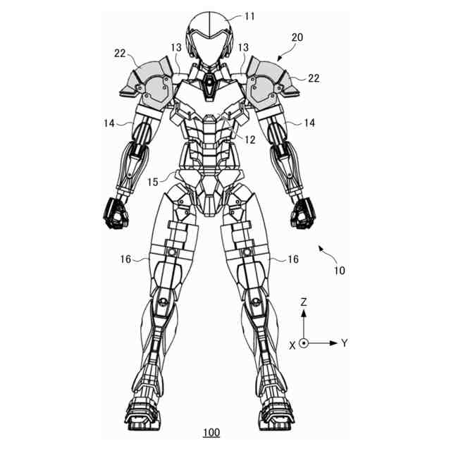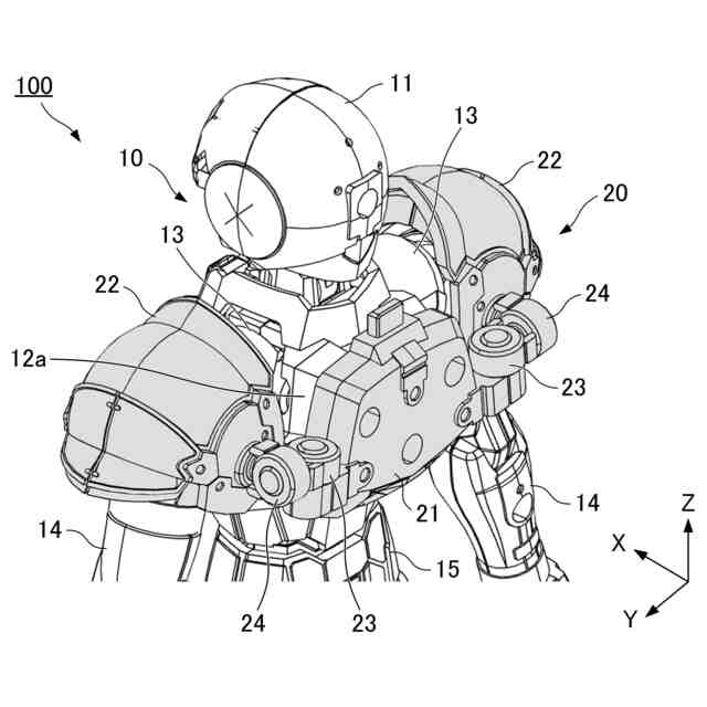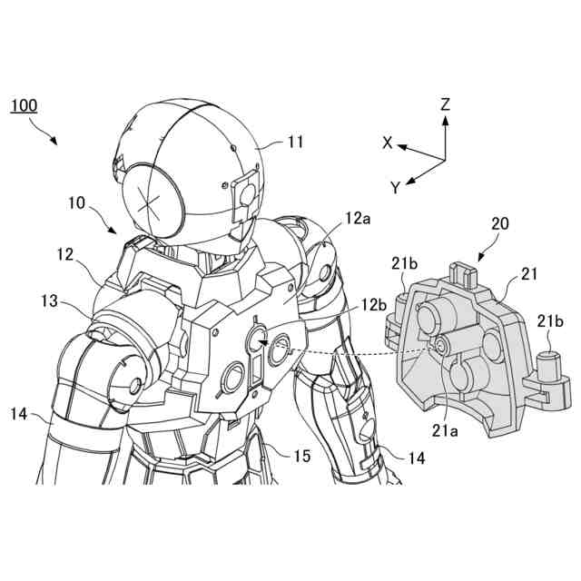 本発明に係る一実施形態の模型玩具100の構成例について説明する。図1は、一実施形態の模型玩具100の模式図である。本明細書では、説明を分かりやすくするため、人形体10の前後方向をX方向とし、人形体10の左右方向をY方向とし、人形体10の上下方向をZ方向とするXYZ座標系で模型玩具100の方向を示す。+X方向は人形体10の前面側を示しており、-X方向は人形体10の背面側を示している。+Y方向は人形体10の左側を示しており、-Y方向は人形体10の右側を示している。+Z方向は人形体10の上側を示しており、-Z方向は人形体10の下側を示している。