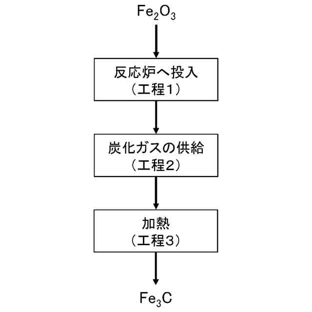 )を反応炉に投入すると共に、反応炉に一酸化炭素と二酸化炭素の混合ガスからなる炭化ガスを供給する。そして、炭素活量をac=1~10となるように調整し、炭化ガスとヘマタイトを還元反応させることで、炭素が析出せずにセメンタイト(Fe