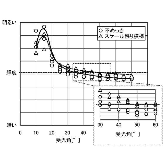 GA鋼板の表面欠陥の一形態として、不めっきが挙げられる。この不めっき部には亜鉛めっきが存在せず地鉄表層が露出するため表面は平坦な酸化鉄層である。更に、GA鋼板の表面には、スケール残り模様と呼ばれるGA鋼板に特有の模様が発生することがある。これは、鋼板表面にスケールが局所的に残存した状態で溶融亜鉛めっきが実施された際に発生するものである。スケール残り模様部の亜鉛めっき層は、模様部直下の鋼板表面において、局所的に残存したスケールによって亜鉛めっきの合金化反応が促進され、正常部よりも厚くなる。このため、鋼板に調質圧延を施すと、スケール残り模様部の表面は周囲よりも強く圧延されて平坦となる。