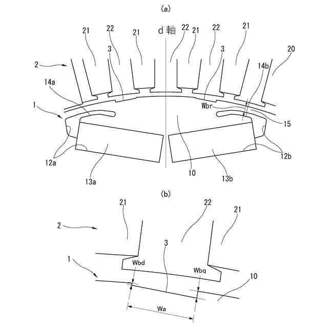 特許文献1のロータは、d軸側に延びるフラックスバリアによりd軸に沿うティースの両隣のティースに流れる磁石磁束が略同程度となるので、エアギャップ磁束密度が高調波を有し、トルクリプルに悪影響を及ぼす。