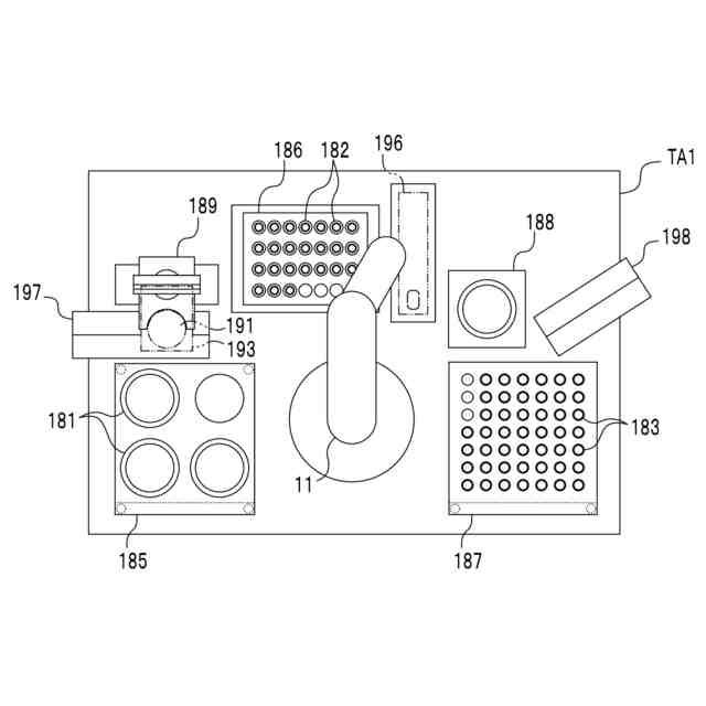 【解決手段】アーム21のフランジ部28に装着されているハンド300は、一対の挟持部材306と、それら挟持部材306を開閉させる開閉機構102とを備えている。挟持部材306は、フランジ部28の回動中心軸線である第6軸AX6の軸線方向に延びるベース部311を有してなる。ベース部311の上端部312には、ベース部311と交差する方向に延びる延出部341が形成されており、延出部341にはビーカを挟持するためのビーカ用挟持部342が設けられている。ベース部311にて延出部341よりも下側となる部分には、ベース部311の内面317を凹ませるようにして、フィルタ挟持部324が形成されている。フィルタ挟持部324は、第6軸AX6と同軸となっている。