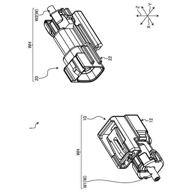 図1は、実施形態に係るコネクタユニット1の分解斜視図である。図1に示される本実施形態のコネクタユニット1は、自動車等の車両に配索されるワイヤハーネスWHに組み込まれるものである。ここで、ワイヤハーネスWHは、例えば、車両に搭載される各機器間の接続のために、電源供給や信号通信に用いられる配索材Wを束にして集合部品とし、コネクタ等で配索材Wを各機器に接続するようにしたものである。本実施形態のワイヤハーネスWHは、例えば、導電性を有する複数の配索材Wと、複数の配索材Wのうち第1シールド電線W1の端末に設けられるコネクタ10と、複数の配索材Wのうち第2シールド電線W2の端末に設けられ、コネクタ10と電気的かつ機械的に接続される相手側コネクタ20と、を備えている。なお、ワイヤハーネスWHは、この他、さらに、グロメットや、固定具など種々の構成部品を含んで構成されてもよい。