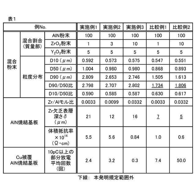 発明者らは研究の結果、ジルコニウム含有粒子を内部に含む窒化アルミニウム焼結基板において、ジルコニウム含有粒子の存在量が非常に少ない表層部を設けることにより、その窒化アルミニウム焼結基板を用いた電子回路用絶縁基板の耐部分放電性を顕著に向上させることができることを見出した。そのような、ジルコニウム含有粒子の特異な分散形態を呈する焼結構造体は、焼結に供するための混合粉末の粒度分布を工夫することにより実現できる。