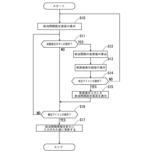 前記操作表示装置に、前記給油間隔を示す入力値の入力を受け付ける給油間隔設定画面を表示させ、