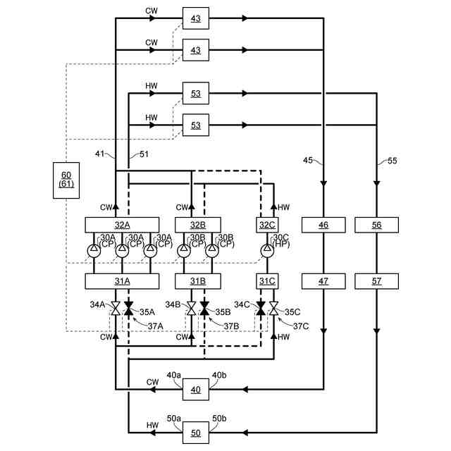 本実施形態の冷温水供給システム(以下「本システム」と呼ぶ)は、図1、図2、及び図3に示すように、空調装置などの冷水利用部43及び温水利用部53に対して、チラーやヒートポンプなどの冷水生成部40及び温水生成部50で生成された冷水CW及び温水HWを供給するシステムとして構成されている。
