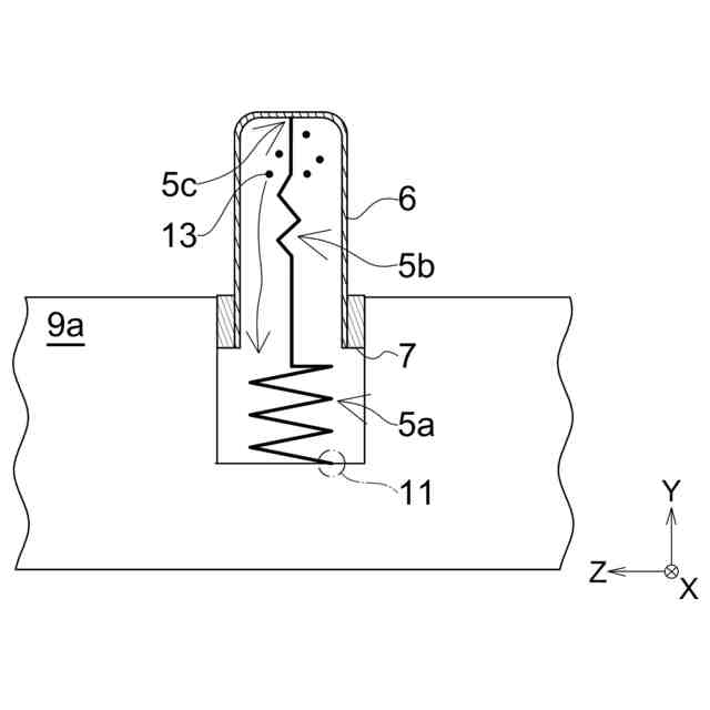 本発明者の鋭意研究の結果、図14に示される構造のランプ電極(9a,9b)、始動電極5及び始動放電容器6を有する紫外光照射装置を長時間使用すると、始動電極5と、始動電極5に接続される部材との接続部が腐食して、当該部材から始動電極5までの導通が悪化する場合があることがわかった。この接続部の腐食の原因を調査したところ、始動電極の先端で発生する放電によって生じる酸化性物質であった。酸化性物質は、F1と付された矢印で示される流れに沿って侵入した大気に含まれる窒素及び水蒸気によって生成されることが判明した。