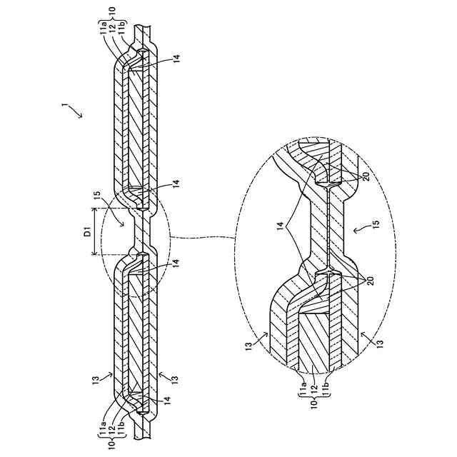 (a)~(c)は、発明者が行った曲げ評価試験を説明するための図であり、(a)は試験用のシート体の平面図、(b)は(a)のX3―X3線断面図、(c)は曲げ試験の状況を説明するための図である。(d)は評価試験の試験結果を説明するための表である。