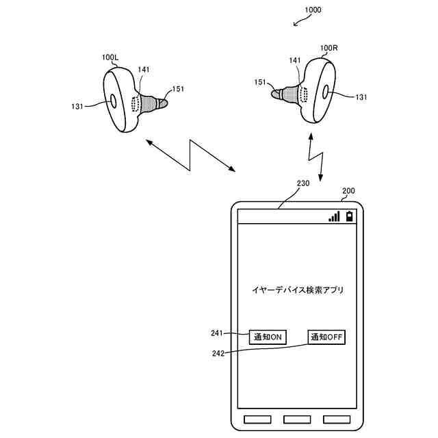 イヤーデバイス通知システム1000は、図1に示すように、ユーザが耳に装着して用いる集音器を含む補聴器であるイヤーデバイス100(右耳に装着するイヤーデバイス100Rと左耳に装着するイヤーデバイス100Lとを区別する必要がない場合には、イヤーデバイス100と言う)と、ユーザが携帯して用いる携帯端末200と、を備え、これらがBluetooth(登録商標)等の近距離無線通信規格により通信接続して動作する。