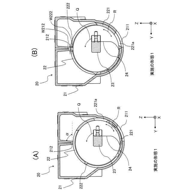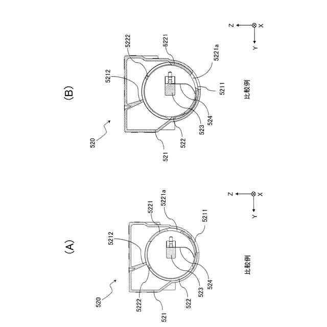(A)及び(B)は、比較例の現像剤収容体のシャッタ部材の断面(シャッタ部材が閉位置にあるとき及び開位置にあるとき)を示す概略断面図である。