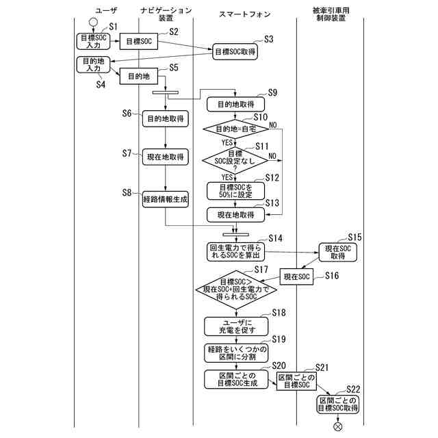 【解決手段】牽引車20に牽引される被牽引車10に搭載される被牽引車用制御装置15であって、目的地到着時のバッテリ11の充電率が予め設定された目標充電率と一致するように、出発地から目的地までの経路情報に基づいて、走行モータ14で生成するアシスト動力と、走行モータ14からバッテリ11に供給する回生電力を調整する。