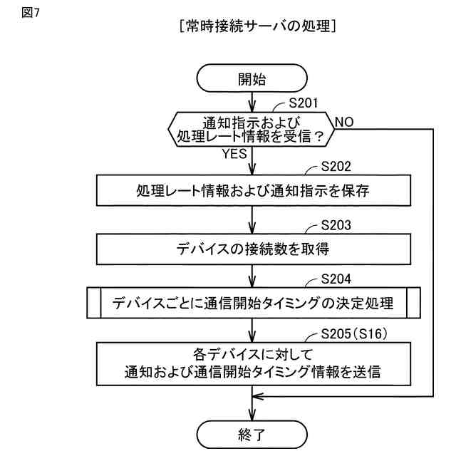 【解決手段】第1サーバと、第1サーバから送信された通知指示を受信する第2サーバと、第2サーバから通知指示に基づく通知を受信する複数のデバイスとを備える。第2サーバは、第1サーバにより指定された処理レートと、第1タイミングにおいて第2サーバと接続されている複数のデバイスの接続数とに基づいて、複数のデバイスごとに異なる通信開始タイミングを決定し、複数のデバイスの各々は、通知を受信した後、通信開始タイミングの経過に基づいて第1サーバとの通信を開始する。
