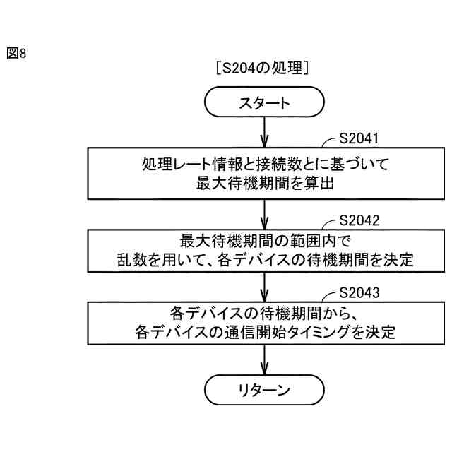 (構成2)構成1において、第2サーバは、第1タイミングにおける接続数と処理レートとに基づいて最大待機期間を決定し、第1タイミングにおいて第2サーバと接続されている複数のデバイスごとに、最大待機期間よりも短い待機期間を決定し、待機期間に基づいて、複数のデバイスごとに通信開始タイミングを決定する。