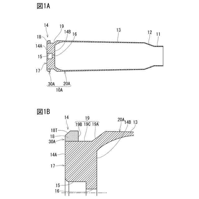 本実施形態の薬莢10Aは、図1A及び図1Bにハッチングの違いで示されているように、リング部品30Aを薬莢本体20Aの一端に嵌合してなる。本実施形態では、例えば、リム18全体がリング部品30Aになっていて、薬莢本体20Aにおける雷管収容部17の外周面全体が、前述の溝部19の溝底面19Cと同径の円筒面になっている。そして、その雷管収容部17の外側にリング部品30Aが嵌合されて、雷管収容部17とリング部品30Aとによってヘッド部14が構成されている。