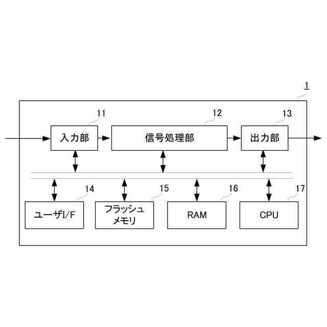図1は、音信号処理装置1の構成を示すブロック図である。音信号処理装置1は、入力部11、信号処理部12、出力部13、ユーザインタフェース(I/F)14、フラッシュメモリ15、RAM16、およびCPU17を備えている。