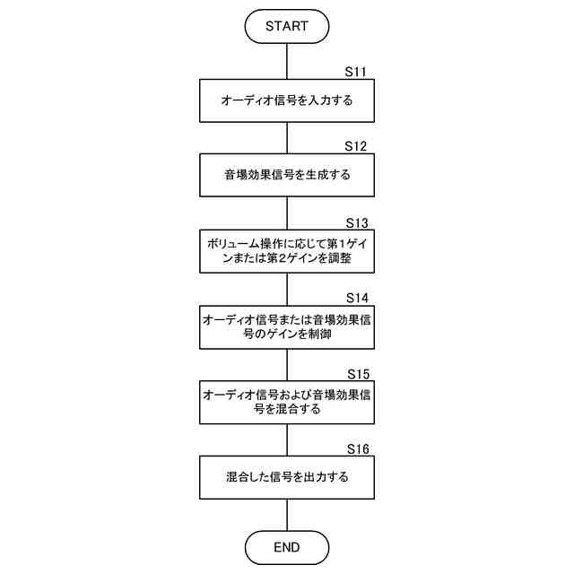 前記ボリューム操作に連動して前記第1ゲインまたは前記第2ゲインを調整することで、前記オーディオ信号と前記音場効果信号とのレベルバランスを調整し、かつ前記ボリューム操作においてボリューム操作を受け付けたとき、少なくとも前記第1ゲインを増減させ、
