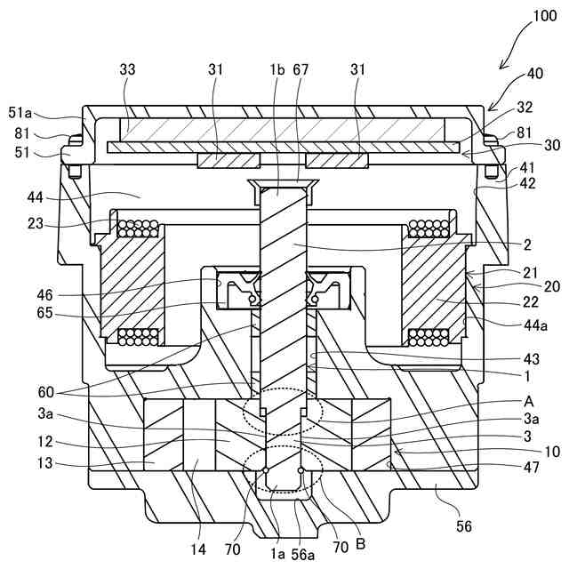 この発明では、駆動シャフトの本体部の外周面とロータの第一挿通孔の内周面との嵌合により、ロータに対する駆動シャフトの径方向への移動が規制され、駆動シャフトの肩部及び駆動シャフトに設けられる抜け止め部材がロータに接触することにより、ロータに対する駆動シャフトの軸方向への移動が規制される。よって、少ない部品点数でロータに対する駆動シャフトの径方向及び軸方向への移動を規制することができる。