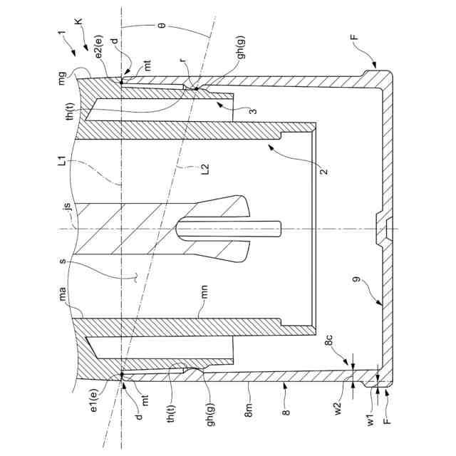 【解決手段】キャップ側係合部tと本体側係合部gとを係脱させることによりキャップCを本体Aに対して着脱可能に構成したキャップ係合構造Kであって、周壁部8に形成された開口縁eのうち最も離間する関係にある一対の縁部点e1、e2間を結ぶ第一仮想線L1に対して、一対の縁部点e1、e2における何れか一方の縁部点e1と当該一方の縁部点e1から最も離間するキャップ側係合部tと本体側係合部gとの係合点rとの間を結ぶ第二仮想線L2の傾斜角度Θが8°以上に設定されている。