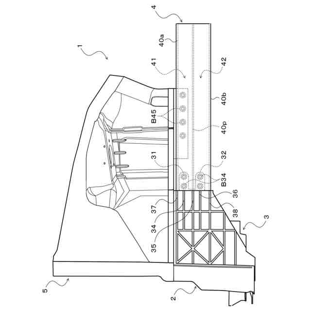 図1は、本開示の車体構造1を示す斜視図であり、図2は、車体構造1を示す分解斜視図である。これらの図面に示すように、車体構造1は、ダッシュクロスメンバー2、トルクボックス3、サイドメンバー4およびサスタワー5とを含み、図示しない車両のアンダーボディを構成するものである。ダッシュクロスメンバー2は、車両の前輪付近で車幅方向に延在する。トルクボックス3は、例えばアルミニウム合金の鋳造により形成され、ダッシュクロスメンバー2に複数のボルトを介して固定される。サイドメンバー4は、複数のボルトB34を介してトルクボックス3に連結され、衝撃吸収部材(いわゆる、EA材)として機能する。サスタワー5は、例えばアルミニウム合金の鋳造により形成され、トルクボックス3およびサイドメンバー4に複数のボルトB35,B45(図2参照)を介して固定される。なお、トルクボックス3およびサスタワー5は、鋳造により一体に形成されてもよい。
