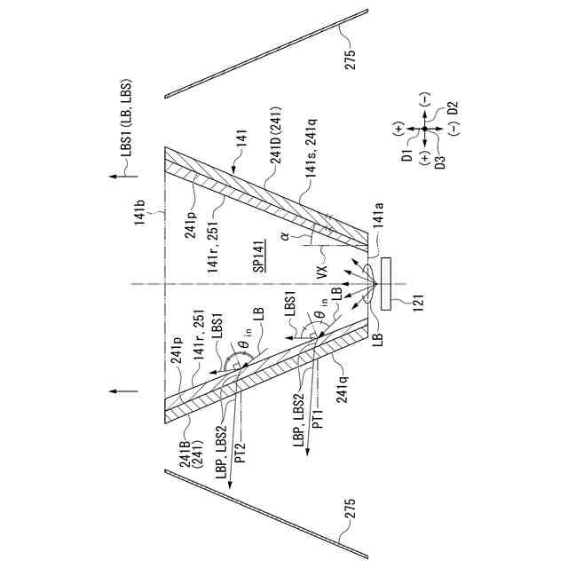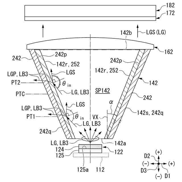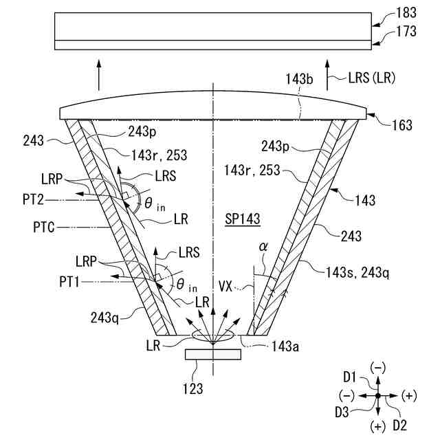 青色光射出部101は、青色光LBを射出する。以下の説明では、青色光射出部101から射出される青色光LBの光軸に平行な軸を方向を、D1方向とする。D1方向における一方の側を-D1側とし、D1方向における-D1側とは反対側を+D1側とする。青色光LBの光軸を含む面内でD1方向に直交する方向を、D2方向とする。D2方向における一方の側を-D2側とし、D2方向における-D2側とは反対側を+D2側とする。D1方向及びD2方向に直交する方向をD3方向とする。青色光射出部101から射出された青色光LBは、D1方向に沿って+D1側に進行する。