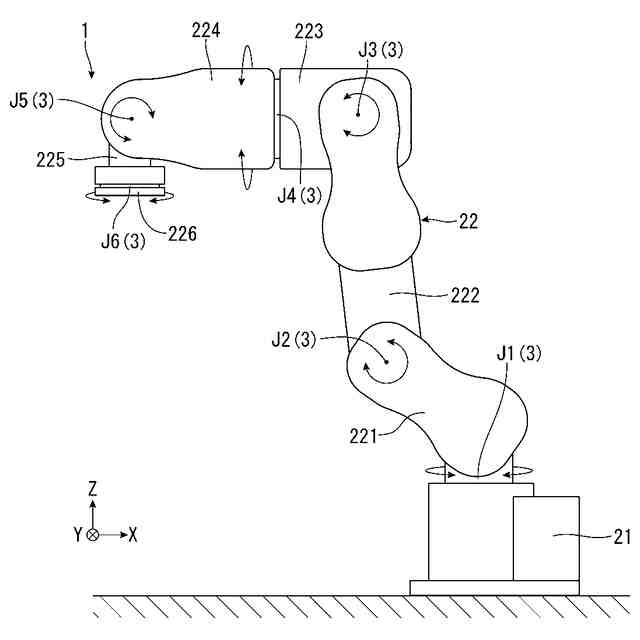特許文献1に記載されたロボットは、基台と、基台に変位可能に連結されたロボットアームと、を有するロボット本体を有する。ロボットアームは、基台に回動可能に連結された第1アームと、第1アームに回動可能に連結された第2アームと、第2アームに回動可能に連結された第3アームと、第3アームに回動可能に連結された第4アームと、第4アームに回動可能に連結された第5アームと、第5アームに回動可能に連結された第6アームと、を有する。